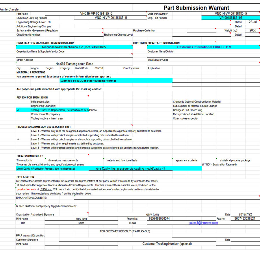 Currently, we provide comprehensive PPAP documentation per customer requirements, covering both castings and machined components, achieving a 95% approval rate. Practice demonstrates that our robust PPAP process significantly reduces product defect rates while enhancing on-time delivery performance and customer satisfaction.